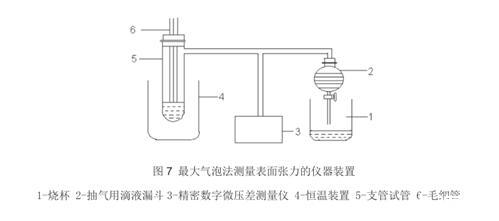 最大壓力氣泡法的原理是將毛細(xì)管端浸入液中,通過增加內(nèi)壓便產(chǎn)生氣泡,然后從管端成長的氣泡的最大泡壓可求出液體的表面張力。 最大壓力氣泡法使用的儀器主要為燒杯、抽氣用滴液漏斗、精密數(shù)字微壓差測量儀、恒溫裝置 、支管試管、毛細(xì)管等。檢測步驟當(dāng)然也先制樣,然后清洗儀器,之后檢驗(yàn)儀器,調(diào)節(jié)毛細(xì)管或液面高度,使毛細(xì)管口與水面相切。打開活塞抽氣,調(diào)節(jié)抽氣速度,使氣泡由毛細(xì)管尖端成單泡出,且每個氣泡形成的時間約為 6s-10s。在形成氣泡的過程中,液面半徑經(jīng)歷:大→小→大,同時壓力差計(jì)指示值的絕對值經(jīng)歷:小→大→小的過程,記錄下絕對值最大的壓力差三次,取其平均值。最大壓力氣泡法每次測量前應(yīng)注意:一定要用待測溶液清洗支管試管和毛細(xì)管,并振蕩洗滌。