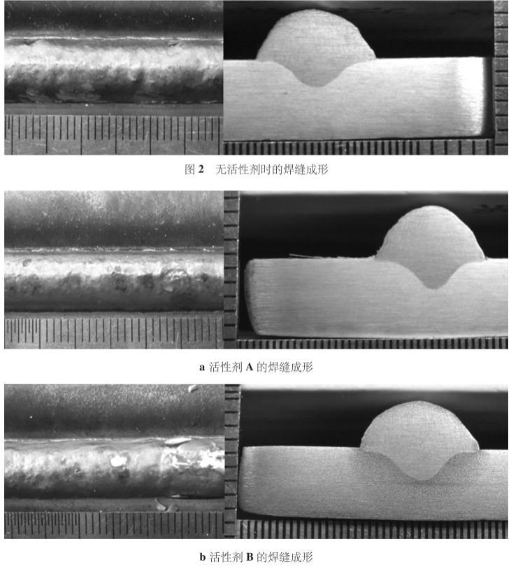 圖2是無(wú)活性劑時(shí)焊縫的宏觀成形,圖3為試驗(yàn)中幾組典型活性劑的金相截面。