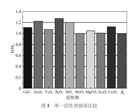 單一活性劑焊縫參數(shù)及無(wú)活性劑時(shí)焊縫參數(shù)如表2所示,表2單一活性劑焊縫參數(shù),圖1是單一活性劑熔深與無(wú)活性劑時(shí)熔深比直方圖。