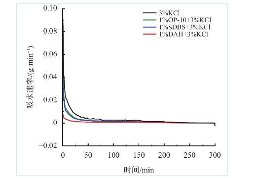由圖5可以看出,水相會在毛細(xì)管力的作用下自吸入巖心,初始階段巖心的自吸水量較大,經(jīng)過200 min后達(dá)到平衡,自吸水量不再增加;加入DAH后,巖心自吸水量下降83.1%,且相較于常用防水鎖劑OP-10、SDBS效果更佳。圖6同樣表明,加入DAH后,巖心自吸水速率大幅降低,整個自吸過程中速率緩慢。上述實驗表明,DAH可以減少因毛細(xì)管力被吸入地層的水相,從而降低水鎖損害發(fā)生的風(fēng)險。