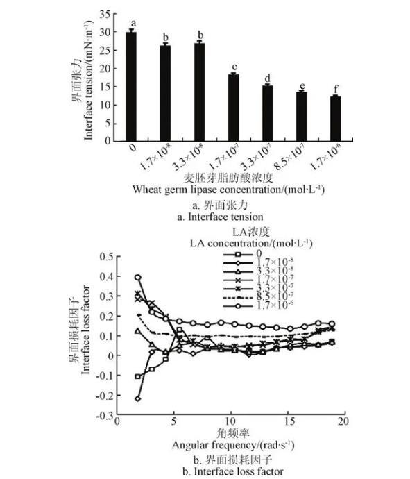 圖1b是不同濃度麥胚LA對油水界面損耗因子(tanδ)即損耗角正切值的影響。tanδ越大,耗散能量的能力越強;由圖可見,tanδ隨麥胚LA濃度的增加而增加,當麥胚LA濃度為1.70×10-6mol/L,tanδ值達到最大。該變化趨勢與界面張力變化趨勢有一定的相似性,原因可能是,麥胚LA濃度具有兩性特性,易富集在油水界面上。隨著其濃度的增加,導致界面黏度增加,進而影響了因界面形變而耗散的能量。綜上,為了能夠觀察到明顯而準確的試驗結果,在后續(xù)研究中選取麥胚LA的濃度為1.70×10-6mol/L。