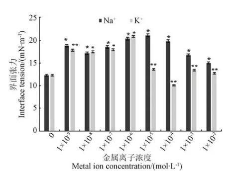 已有研究結果表明,電解質(zhì)的加入能使溶液內(nèi)部粒子之間的相互作用強于純水。因此,在一定濃度范圍內(nèi),電解質(zhì)的加入會使油/水溶液界面張力增大。本研究就Na+、K+離子對油水界面組成與結構的影響進行了驗證研究。如圖2所示,Na+、K+對界面張力的影響相似,對麥胚LA界面張力的影響隨其濃度的增加呈現(xiàn)先增加后降低的趨勢,但高濃度時K+對油水界面張力的影響不及Na+顯著(P<0.05)。當離子濃度在1.0×10-9~1.0×10-6mol/L時,Na+、K+均可明顯提高界面張力。當K+濃度高于1.0×10-5mol/L,麥胚LA的油水界面張力開始明顯降低。原因可能是高濃度無機鹽離子將影響麥胚LA在溶液界面上的聚集數(shù)量和穩(wěn)定性。由于麥胚LA具有類似于分子表面活性劑的性質(zhì),可以緊密吸附界面上,從而降低界面張力。