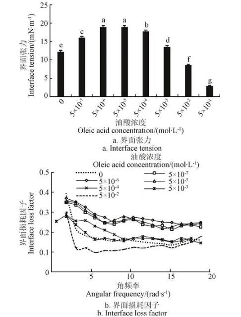 三油酸甘油酯濃度對油水界面特性的影響見圖6。由圖6可見,當麥胚LA濃度為1.70×10-6mol/L時,油水界面張力隨癸烷中三油酸甘油酯濃度的增加呈現(xiàn)先增加后減小的變化規(guī)律;當三油酸甘油酯濃度介于10-5~10-3mol/L時,相同角頻率時界面損耗因子隨著濃度增加無明顯變化規(guī)律。此外,在試驗過程中,界面張力隨時間延長呈現(xiàn)一定下降趨勢,這說明麥胚LA與三油酸甘油酯的水解過程也會對界面張力產(chǎn)生一定影響。原因在于,在界面體系中,三油酸甘油酯可被麥胚LA水解,產(chǎn)生小分子的油酸等,三油酸甘油酯與麥胚LA組成的界面發(fā)生變化,進而影響界面特性。