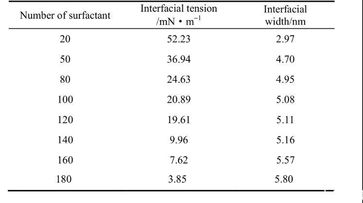 從表1可以發(fā)現(xiàn)表面活性劑數(shù)量的增加使得界面張力逐漸下降。其中當(dāng)OPES數(shù)量由20增加到80時,界面張力值較高,這說明當(dāng)表面活性劑濃度較低時并不能起到很好的降低界面張力的作用;隨著表面活性劑數(shù)量進一步增加界面張力逐漸下降,當(dāng)OPES數(shù)量為180時,達(dá)到臨界飽和狀態(tài),此時界面張力僅為3.85 mN·m-1,此變化規(guī)律與真實實驗規(guī)律相同。這同時也說明辛基酚聚氧乙烯醚磺酸鹽可以很好地降低界面張力,是一種性能優(yōu)良的表面活性劑。界面寬度用體系密度圖中表面活性劑的密度曲線寬度來表示。隨著表面活性劑個數(shù)增加界面寬度遞增,起初界面寬度增加速度較快是因為界面OPES濃度過低并未飽和;當(dāng)OPES數(shù)量達(dá)到100~140時,界面寬度僅有少量緩慢增加這是由于此時界面正在逐漸接近飽和狀態(tài)。隨著OPES的數(shù)量達(dá)到160和180時,界面寬度增加幅度變大,進一步驗證此時界面已達(dá)到飽和狀態(tài)。