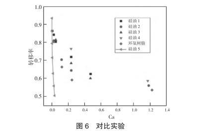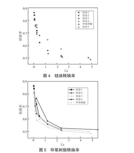 對不同黏度以及拉伸速度下的膠液進行測量并計算轉移率,如圖4所示,在忽略慣性力的條件下,采用無量綱數Ca來表示轉移率,對于表面張力相似且不同黏度的四種甲基硅油的轉移率有著相似的收斂情況。為了進一步印證Ca對轉換率的影響,引入與甲基硅油不同表面張力的環氧樹脂進行對比實驗,如圖5所示,表面張力較大的環氧樹脂的轉換率會比甲基硅油小,但整體趨勢相差不大,均會收斂到一定數值。之后,為了了解慣性力對轉移率的影響,選擇黏度較小的膠液進行實驗,同時加大移液針直徑使其脫離微量點膠的范圍,以提高慣性力對膠液傳遞的影響,如圖6所示,在通過增加膠液體積以提高慣性力影響的實驗中,膠液轉移率的變化與之前有極大差異。