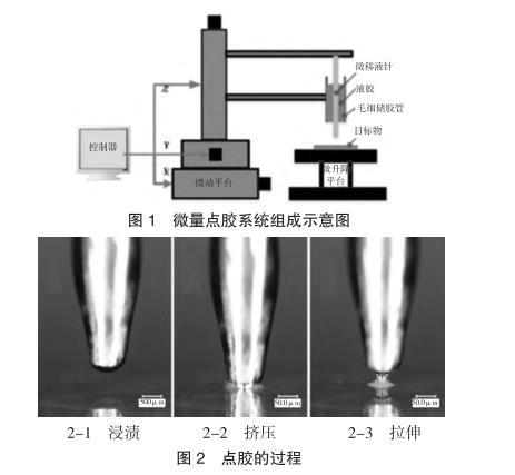 本課題組研制了一種基于移液針轉印原理的微量點膠系統,該點膠系統所形成的膠斑直徑可達到數十微米,膠滴體積可達飛升-皮升的范圍。該系統的結構如圖1所示。該系統由出膠單元、驅動單元和控制單元組成。其中,出膠單元為系統的核心,其主要包含微移液針和毛細儲膠管兩個關鍵元件,移液針通過在儲膠管內的上下往復運動,實現膠液向基板的微量轉移。驅動單元由X/Y/Z三個方向的驅動電機和微升降平臺組成,用于驅動微移液針及點膠工件的運動。控制單元由PLC控制系統和LaBview開發的控制面板組成,實現對電機運動的自動控制。