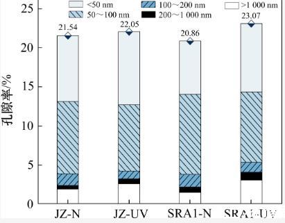 2)強紫外線輻射環境對不同組分水泥石干縮變形的影響不同。與基準組相比,SRA試驗組的干縮值極大程度降低。然而,SRA促進了水泥石的水分散失,增大了水泥石體系中大于200 nm的大孔比例,由此帶來的結構劣化問題不可忽視。