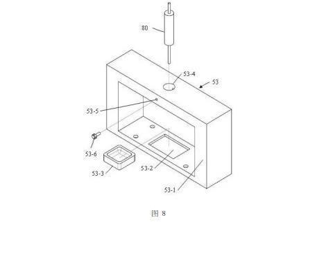 如圖8所示,第三窗形件53的第三邊框部53-1的下邊框上設(shè)置有一個(gè)例如長方形的凹坑53-2,并且沿左右方向凹坑53-2位于第三邊框部53-1的中間位置,凹坑53-2內(nèi)設(shè)置有一個(gè)積液盆53-3。第三窗形件53的第三邊框部53-1的上邊框上設(shè)置有一個(gè)例如圓形的第三通孔53-4,第三通孔53-4沿豎直方向延伸,并且第三通孔53-4位于凹坑53-2的正上方;注射器80包括主體管80-1和固定設(shè)置于主體管80-1下端面的針管80-2,主體管80-1和針管80-2均為內(nèi)部中空的圓形管,并且針管80-2的直徑小于主體管80-1的直徑,針管80-2與主體管80-1的內(nèi)部空腔相連通;注射器80的主體管80-1固定設(shè)置于第三通孔53-4內(nèi),并且針管80-2的末端剛好與攝像機(jī)61的中心軸線(即光源62的中心軸線)相交。在本實(shí)施例中,第三窗形件53的第三邊框部53-1的上邊框的側(cè)面設(shè)置有一個(gè)沿前后方向延伸的第一螺紋孔53-5,并且第一螺紋孔53-5與第三通孔53-4相連通;螺栓53-6設(shè)置于第一螺紋孔53-5內(nèi),螺栓53-6的外螺紋能夠與第一螺紋孔53-5相嚙合,并且螺栓53-6的里端能夠與注射器80的主體管80-1外壁相抵接,從而使得注射器80的主體管80-1固定設(shè)置于第三通孔53-4內(nèi)。