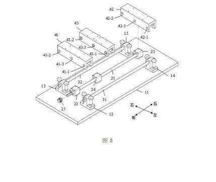 第一導(dǎo)桿31從前往后依次穿過第一左通孔41-1、第三左通孔43-1、以及第二左通孔42-1,第一導(dǎo)桿31的前端與第一左通孔41-1固定連接,第一導(dǎo)桿31的后端與第二左通孔42-1固定連接;第二導(dǎo)桿32從前往后依次穿過第一右通孔41-2、第三右通孔43-2、以及第二右通孔42-2,第二導(dǎo)桿32的前端與第一右通孔41-2固定連接,第二導(dǎo)桿32的后端與第二右通孔42-2固定連接。第一絲桿21從前往后依次穿過第一中間通孔41-3、第三中間通孔43-3、以及第二中間通孔42-3。