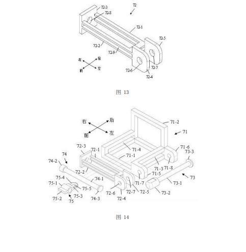 如圖13所示,滑動(dòng)座72包括第一U形板72-1、第二U形板72-2、蓋形板72-3、第一尾板72-4、以及第二尾板72-5。第一U形板72-1和第二U形板72-2的開口端都與蓋形板72-3的左側(cè)面(即里側(cè)面)固定連接,并且第一U形板72-1和第二U形板72-2均與蓋形板72-3相垂直,其中蓋形板72-3沿豎直方向延伸且蓋形板72-3上設(shè)置有通孔72-8,第一U形板72-1和第二U形板72-2均沿水平方向延伸;第一U形板72-1位于第二U形板72-2的上方,第一U形板72-1與第二U形板72-2相互平行且二者之間設(shè)置有一個(gè)縫隙72-9。在本實(shí)施例中,第一U形板72-1與第二U形板72-2相同。