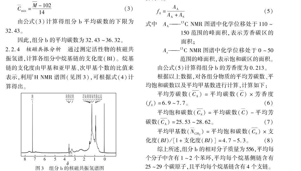 綜上所述,組分b的相對分子質量為556,平均每個分子中含有1~2個苯環,平均每個烷基側鏈含有25~29個碳原子,且平均每個烷基鏈含有4個支鏈。