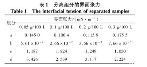 由表1可知,組分b質量濃度達到0.2 g/100 L時,即可使該油/水體系的界面張力降至超低(低于10-3mN/m),而其他組分即使在較高質量濃度的情況下,依然不能使其油/水體系的界面張力達到超低,其中組分d在降低該體系界面張力方面的能力最差。說明石油磺酸鹽活性組分的組成差異是影響系列石油磺酸鹽具有不同界面活性的主要因素。
