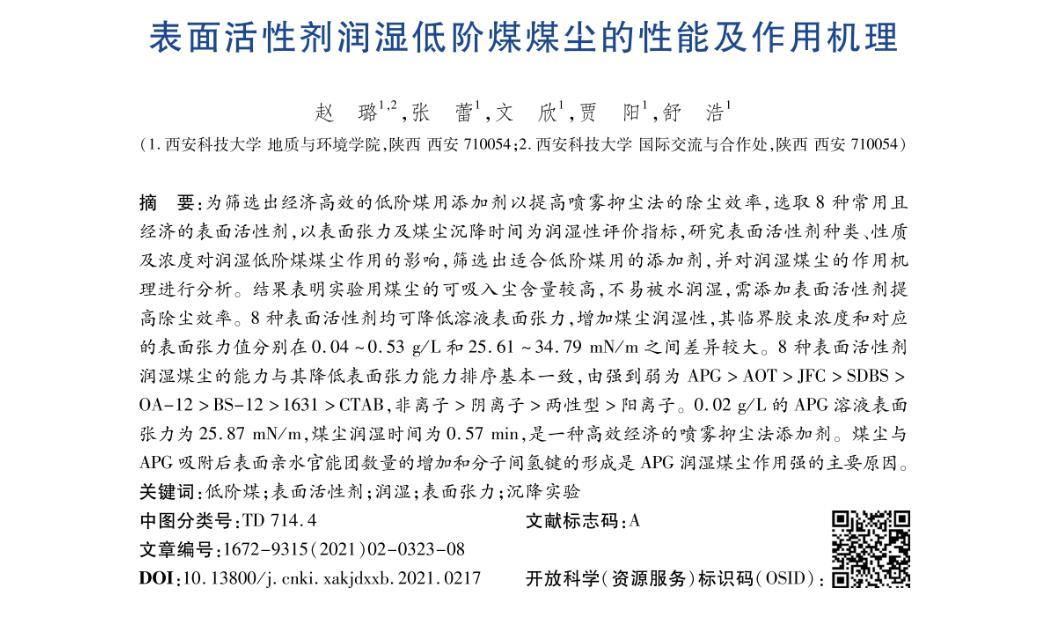 摘要:為篩選出經濟高效的低階煤用添加劑以提高噴霧抑塵法的除塵效率,選取8種常用且經濟的表面活性劑,以表面張力及煤塵沉降時間為潤濕性評價指標,研究表面活性劑種類、性質及濃度對潤濕低階煤煤塵作用的影響,篩選出適合低階煤用的添加劑,并對潤濕煤塵的作用機理進行分析。結果表明實驗用煤塵的可吸入塵含量較高,不易被水潤濕,需添加表面活性劑提高除塵效率。8種表面活性劑均可降低溶液表面張力,增加煤塵潤濕性,其臨界膠束濃度和對應的表面張力值分別在0.04~0.53 g/L和25.61~34.79 mN/m之間差異較大。8種表面活性劑潤濕煤塵的能力與其降低表面張力能力排序基本一致,由強到弱為APG>AOT>JFC>SDBS>OA-12>BS-12>1631>CTAB,非離子>陰離子>兩性型>陽離子。0.02 g/L的APG溶液表面張力為25.87 mN/m,煤塵潤濕時間為0.57 min,是一種高效經濟的噴霧抑塵法添加劑。煤塵與APG吸附后表面親水官能團數量的增加和分子間氫鍵的形成是APG潤濕煤塵作用強的主要原因。