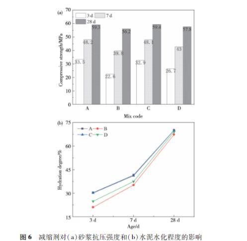圖6減縮劑對(a)砂漿抗壓強度和(b)水泥水化程度的影響