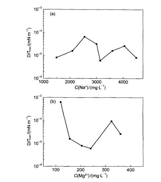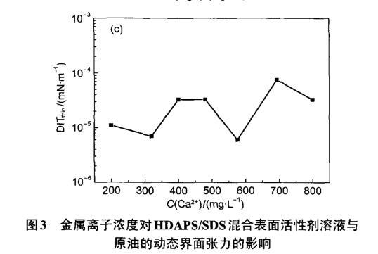 圖3金屬離子濃度對(duì)HDAPS/SDS混合表面活性劑溶液與原油的動(dòng)態(tài)界面張力的影響