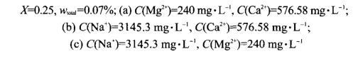 配制溶液所用的是高礦化度且含有高濃度二價(jià)金屬離子的模擬礦化水,從上面的實(shí)驗(yàn)結(jié)果中看出,HDAPS/SDS混合體系在高鹽條件下可以與原油達(dá)到超低界面張力。考慮到在實(shí)際應(yīng)用過程中地層水的礦化度可能發(fā)生變化,恒定模擬水中Na+、Mg2+和Ca2+中兩種金屬離子的濃度,考察了Na+、Mg2+和Ca2+濃度變化對(duì)HDAPS/SDS混合體系與原油界面張力的影響,實(shí)驗(yàn)結(jié)果如圖3所示。從圖中可以看出,模擬水中Na+濃度在1500-4500 mg·L-1、Mg2+濃度在120-360 mg·L-1和Ca2+濃度在200-800 mg·L-1范圍內(nèi)變化時(shí),HDAPS/SDS混合體系與原油的界面張力均可達(dá)到超低界面張力,這說明在高礦化度和高濃度二價(jià)金屬離子條件下,HDAPS/SDS混合體系也表現(xiàn)出非常優(yōu)異的界面活性。