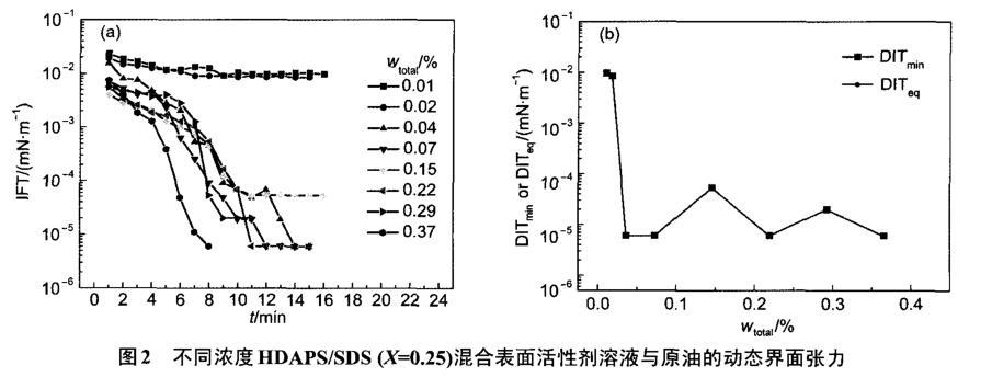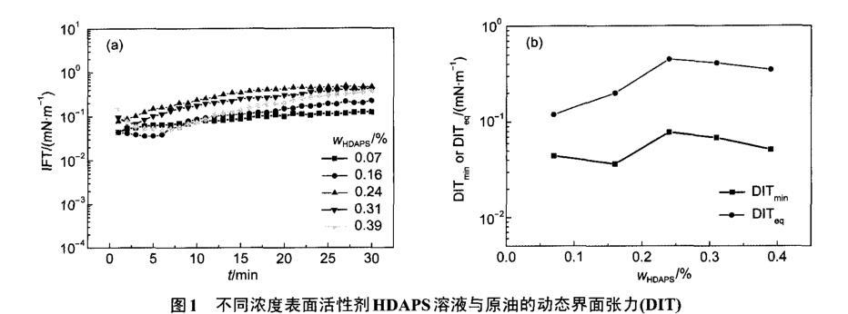 圖1不同濃度表面活性劑HDAPS溶液與原油的動(dòng)態(tài)界面張力(DIT)