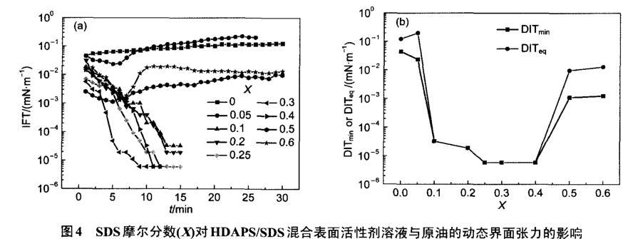 圖4 SDS摩爾分數(X)對HDAPS/SDS混合表面活性劑溶液與原油的動態(tài)界面張力的影響