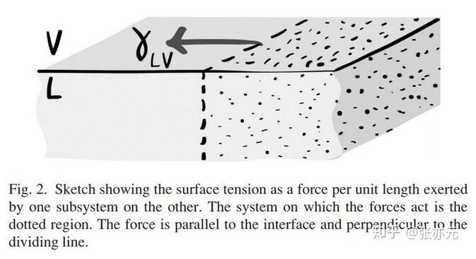 熱動力學觀點和力學觀點可以用虛功原理聯系起來。圖1中的界面處的分子明顯受到一個垂直于界面方向的力,但圖2中的力明顯平行于界面,那么第1個關鍵問題就是:為什么表面張力是一個平行于界面的力,即使它似乎一定垂直于界面?