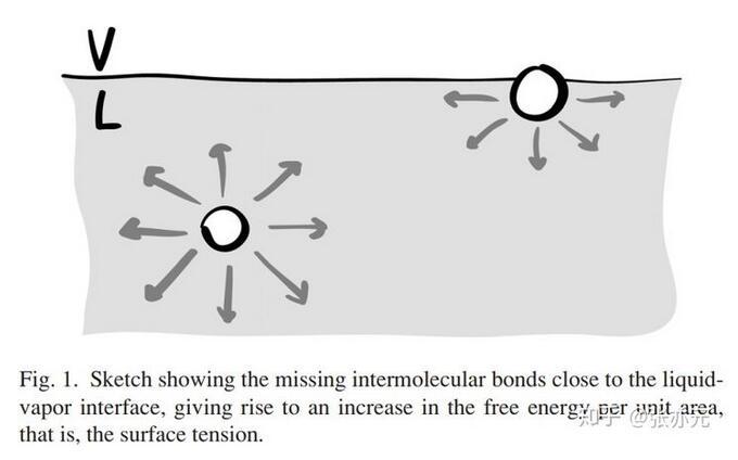 借鑒Gibbs的開創性工作,我們可以將表面張力理解成因兩本體相間界面存在導致的額外表面能。液-氣界面附近的液體分子所處的環境與本體中的分子不同,這種差異經常被人用圖1的示意圖表現,即近乎一半的分子間引力缺失,這導致自由能的增加,這是熱動力學的觀點。