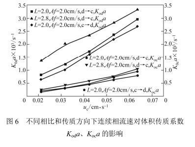 兩相流速、相比與傳質(zhì)方向?qū)w積傳質(zhì)系數(shù)的影響見圖6。圖中結(jié)果顯示:分別用有機(jī)相溶質(zhì)濃度和水相溶質(zhì)濃度表示傳質(zhì)推動(dòng)力得到的體積傳質(zhì)系數(shù)Koda和Koca隨著連續(xù)相流速的增加而增大,傳質(zhì)方向相同(d→c)時(shí),高相比的體積傳質(zhì)系數(shù)(Koda或Koca)大于低相比的體積傳質(zhì)系數(shù)。其原因主要還在于高流速和高相比的情況下,傳質(zhì)相界面積a更大。