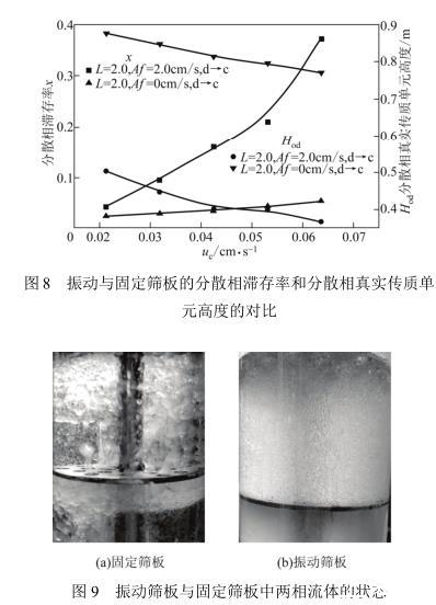 圖8給出了正丁醇-丁二酸-水體系分別在振動(dòng)篩板塔與固定篩板塔中的分散相滯存率和分散相“真實(shí)”傳質(zhì)單元高度的對(duì)比。圖中顯示振動(dòng)篩板塔中分散相滯存率x明顯高于固定篩板塔中的x,傳質(zhì)單元高度Hod遠(yuǎn)低于固定篩板塔的Hod,而且振動(dòng)篩板塔的x受連續(xù)相流速影響大,固定篩板塔的x受流速的影響微乎其微。這是由于兩種塔的萃取狀態(tài)不同(圖9),固定篩板塔的操作處于混合-澄清區(qū)[圖9(a)],振動(dòng)篩板塔的操作處于分散區(qū)[圖9(b)]。