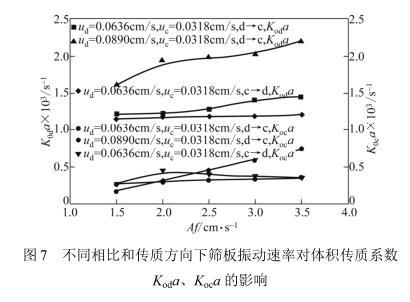 圖7不同相比和傳質(zhì)方向下篩板振動(dòng)速率對(duì)體積傳質(zhì)系數(shù)Koda、Koca的影響