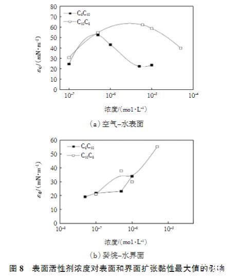 表面活性劑濃度對表面和界面擴張黏性最大值的影響如圖8所示。