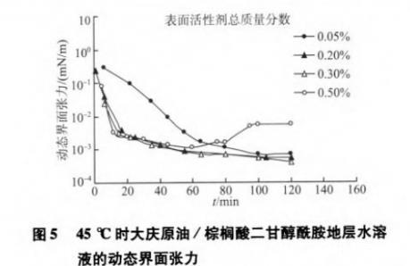 圖5 45℃時大慶原油/棕櫚酸二甘醇酰胺地層水溶液的動態界面張力