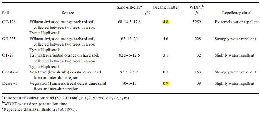 來自以色列不同地區(qū)的五種防水土壤 過篩(1 毫米)并在室溫下儲存在玻璃容器中 實驗室條件(平均溫度 ? 24.5°C,平均 相對濕度 (RH) ? 65%)。 兩種土壤 (OE-128 和 OE-335; 典型的單氟草胺)是從相同的 污水灌溉的商業(yè)柑橘園與以前一樣 研究(Wallach 等人,2005 年;Graber 等人,2006 年)位于 以色列沿海平原的中部(31°59¢30.562)。 一 土壤(OT-28;典型單頭草)是從水龍頭中獲得的 同一商業(yè)果園的水灌溉柑橘地塊。 一種 沙丘沙是從附近的沙丘間地區(qū)獲得的 位于地中海的尼察尼姆自然保護(hù)區(qū) (31°16¢37.242) 海(Coastal-1)和來自沙間地區(qū)的粘土砂 內(nèi)蓋夫北部沙漠 (30°52¢02.592; (Desert-1) 的 Halutza 附近。表 1 列出了顯著的土壤特征。