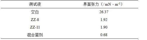 從表2實驗結果中可以看出與空白相比解淀粉芽孢桿菌(Bacillusamyloliquefaciens)ZZ-11、膠凍樣芽孢桿菌(Bacillus mucilaginosus)ZZ-8的界面活性好,油水界面低至1.92 mN/m和1.90mN/m,為低界面張力水平。混合菌劑的界面活性更為突出,低至0.68mN/m。
