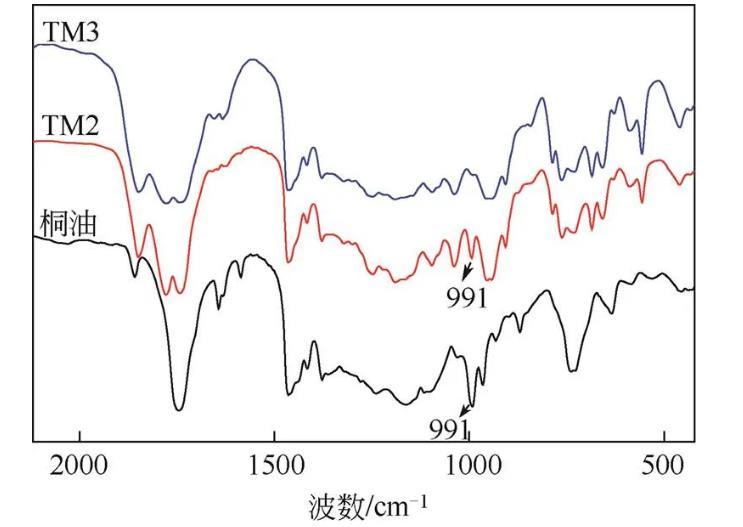 桐油中的共軛不飽和鍵與馬來酸酐易發生Diels-Alder(D-A)反應,生成桐油酸酐,反應條件對產物的分布具有重要影響。由于桐油為混合物,每分子中有3條不飽和鏈,控制MA的加入量及反應條件,可以控制桐油二酸酐(TM2)和桐油三酸酐(TM3)的形成。文獻報道大多數桐油和馬來酸酐反應以有機錫為催化劑,經過研究發現,溫度對馬來酸酐與桐油反應影響較大,溫度低反應很慢,有機錫催化劑并不能明顯降低反應溫度。在無催化劑的條件下,以紅外光譜跟蹤80℃、100℃、120℃及140℃下桐油與3倍量的馬來酸酐反應的情況,結果表明80℃下反應緩慢,100℃反應1h后桐油的共軛三鍵的紅外吸收峰幾乎完全消失,反應程度能達到96%。桐油及桐油酸酐的FTIR如圖1所示,991cm–1為桐油共軛三鍵的面外彎曲振動紅外吸收峰,兩倍量馬來酸酐與桐油反應的產物(TM2)中991cm–1的吸收峰明顯減弱但未消失,3倍量馬來酸酐與桐油反應的產物中該峰完全消失,說明桐油分子上的共軛三鍵可以同馬來酸酐反應形成三酸酐TM3。