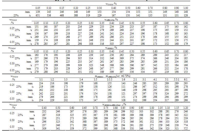 由表3可見,單一的YM-316溶液即可滿鋪在環己烷表面,表現出較強的鋪展性能。其中,最低鋪展質量分數為0.05%,此時鋪展時間為301.3s。隨著YM-316質量分數不斷增大,鋪展時間不斷減小,當YM-316質量分數達到1.0%時,鋪展時間降低至5.8s。另外,在YM-316分別與APG0810和APEC-10Na的二元復配體系中,當YM-316的質量分數為0.25%、0.30%和0.35%時,在質量分數為0.055%~1.0%的范圍內,隨著APG0810或APEC-10Na濃度的增加,其體系的鋪展時間逐漸縮短,這種趨勢在低濃度區域較高濃度區域要大;而在APG0810或APEC-10Na相同濃度下,隨YM-316質量分數增加其體系的鋪展時間也逐漸縮短。這些均表明YM-316與APG0810或APEC-10Na對環己烷表面的鋪展作用有良好相互促進效果,YM-316與APG0810和APEC-10Na組成的三元復配體系也是如此,且三元體系的鋪展性能比二元體系更好。氟表面活性劑的成本常常占到水成膜泡沫滅火劑成本的80%,APG0810和APEC-10Na作為一種良好的鋪展助劑,添加到含YM-316的滅火劑中,可在保持溶液原有鋪展性能的情況下,大幅降低YM-316的用量,從而大大降低水成膜泡沫滅火劑的成本。