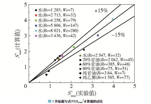 圖9為Smax*實(shí)驗(yàn)值與式(15)的Smax*計(jì)算值的對比,式(15)的Smax*計(jì)算值與實(shí)驗(yàn)值誤差在大部分情況下都小于15%,因此在75 < Re < 9000,7 < We < 300時,可使用式(15)預(yù)測液滴撞擊不銹鋼固體表面的最大鋪展面積。