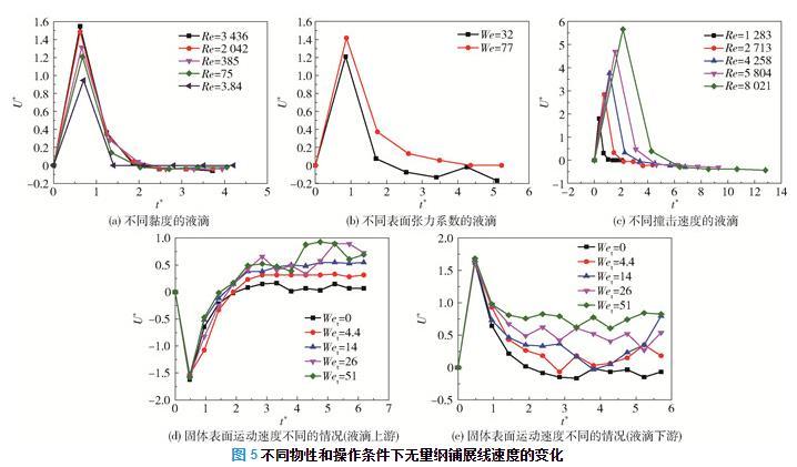 在固體表面水平運(yùn)動時,定義液滴上游方向?yàn)橐旱武佌古c固體表面運(yùn)動相同的方向,反之為液滴下游方向。如圖5(d)所示,液滴上游鋪展線速度(絕對值)在撞擊后的短時間內(nèi)增加到最大值,但由于其方向與固體表面運(yùn)動方向相反,隨著固體表面運(yùn)動速度的增大,液滴受到的黏性力增大,且上游鋪展線速度降低。液滴上游鋪展線速度降至0之后,黏性力與上游鋪展線速度的方向開始相同,此時黏性力作正功,因此固體表面運(yùn)動速度的增大會使得上游鋪展線速度增大,直至上游鋪展線速度與表面運(yùn)動速度相等。如圖5(e)所示,在撞擊的瞬間,液滴下游鋪展線速度大于表面的運(yùn)動速度,此時黏性力做負(fù)功,且下游鋪展線速度會逐漸減小至固體表面運(yùn)動速度。