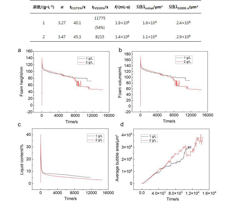 泡沫發(fā)泡性和穩(wěn)定性是表征泡沫性能的重要參數(shù)。我們配制了不同質(zhì)量分數(shù)的C72-MPB水溶液,對其泡沫性能進行測試。