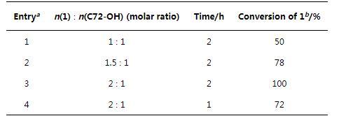 我們將原料1和C72-OH等物質(zhì)的量比混合,以超干四氫呋喃(THF)為溶劑,在0℃下進行反應,2 h后通過核磁氫譜(1H NMR)觀測到有產(chǎn)物生成。但原料C72-OH的轉(zhuǎn)化率僅為50%(表1,Entry 1)。因此,我們對反應物的比例、反應時間做進一步優(yōu)化。結(jié)果顯示:在原料1與原料C72-OH物質(zhì)的量比為2∶1,反應時間為2 h的條件下,原料C72-OH可完全轉(zhuǎn)化(表1,Entry 3)。接下來,我們將中間體C72-P與3 equiv.三甲胺(2 mol/L in THF)溶解在乙腈中,在70℃下反應48 h,高產(chǎn)率得到目標產(chǎn)物C72-MPB.用類似方法合成了結(jié)構(gòu)相似的氟碳表面活性劑6:2-MPB(表2),并對比了C72-MPB與6:2-MPB的表面活性性能。