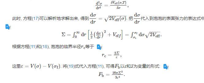 在偽真空的環(huán)境下,大小不一的真真空泡泡,由于量子漲落和熱漲落隨機(jī)出現(xiàn)并消失,直至泡泡的半徑大于等于臨界半徑,然后這些泡泡就會(huì)一直膨脹下去,完成一級(jí)相變的相變過程,并把多余的體系自由能以相變潛熱的形式釋放到環(huán)境中。基于這個(gè)機(jī)制,單位時(shí)間單位體積的臨界泡泡成核率可以表示為