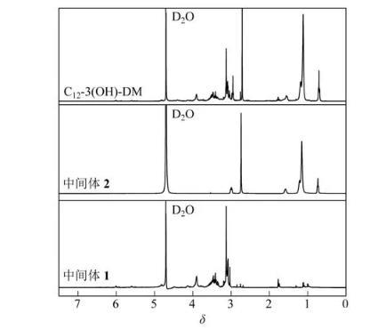 (1)以甲基丙烯酸二甲氨基乙酯(DM)、環氧氯丙烷(ECH)和3種長鏈烷基叔胺為主要原料,合成了3種反應型陽離子Gemini表面活性劑C12-3(OH)-DM、C14-3(OH)-DM和C16-3(OH)-DM,并通過紅外光譜、核磁共振光譜和元素分析證實得到了目標產物。