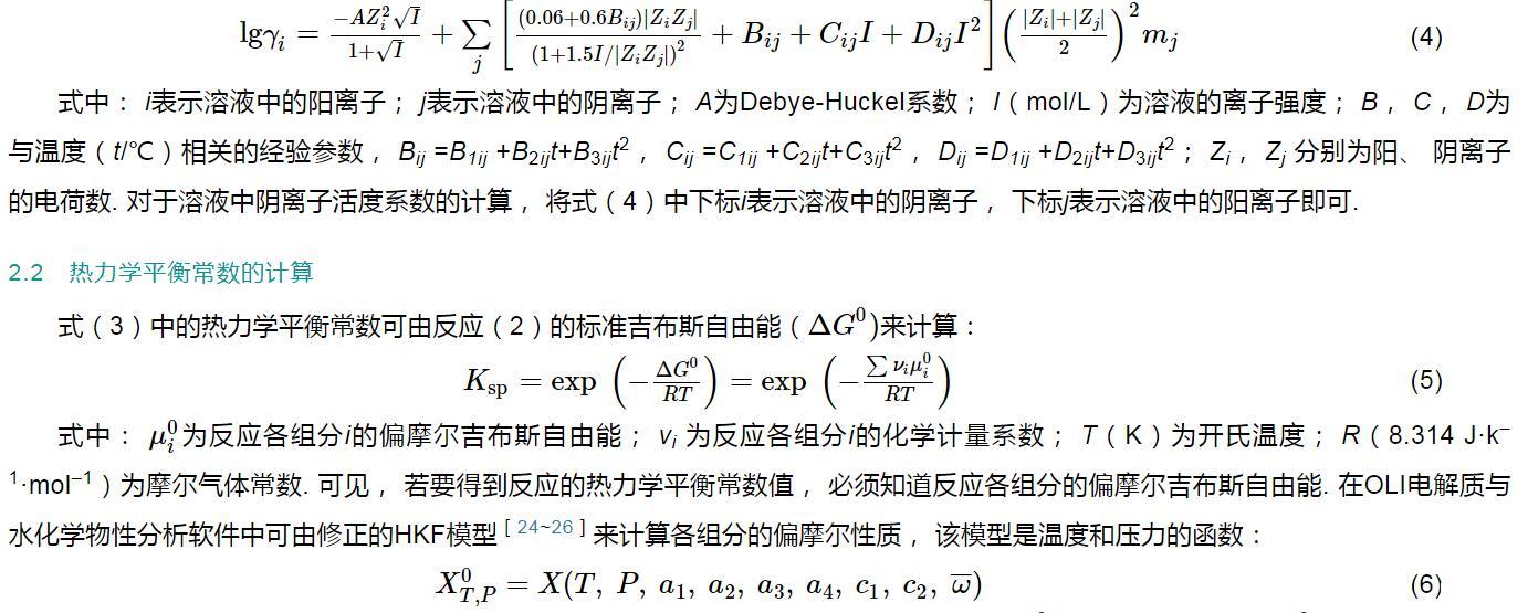 因此,式(3)中離子的活度系數可由OLI電解質與水化學物性分析軟件[20]內嵌的Bromley-Zemaitis方程[22,23]來計算:
