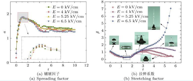 為了更詳細地研究垂直電場對液滴鋪展的影響,根據(jù)實驗獲得的連續(xù)照片分別測量了液滴演變過程中動態(tài)鋪展直徑L。圖3(a)描述了無電場和三種不同模式下液滴的鋪展因子α隨無量綱時間τ的變化。液滴撞擊后在短時間內(nèi)擴散并且?guī)缀跬瑫r達到最大鋪展狀態(tài),隨后液滴開始回縮,對應(yīng)的鋪展因子趨勢下降,最后進入液滴振蕩階段,由于液滴和表面的釘住作用,鋪展因子逐漸趨于穩(wěn)定。從圖3(a)可以看出,不同場強下的液滴在τ=1.19時達到最大鋪展,并且最大鋪展因子隨著電場強度的增加而小幅度增大,這是因為分布在液滴表面上的同類自由電荷之間的庫侖斥力會引入與表面張力相反方向的靜電力,額外的靜電力會減弱液體表面張力,進一步增強液滴的擴散。無電場與場強最大的液滴的最大鋪展因子相差小于2%,說明在液滴鋪展階段,電場力不是主導(dǎo)影響因素,這與前人的研究結(jié)果保持基本一致。