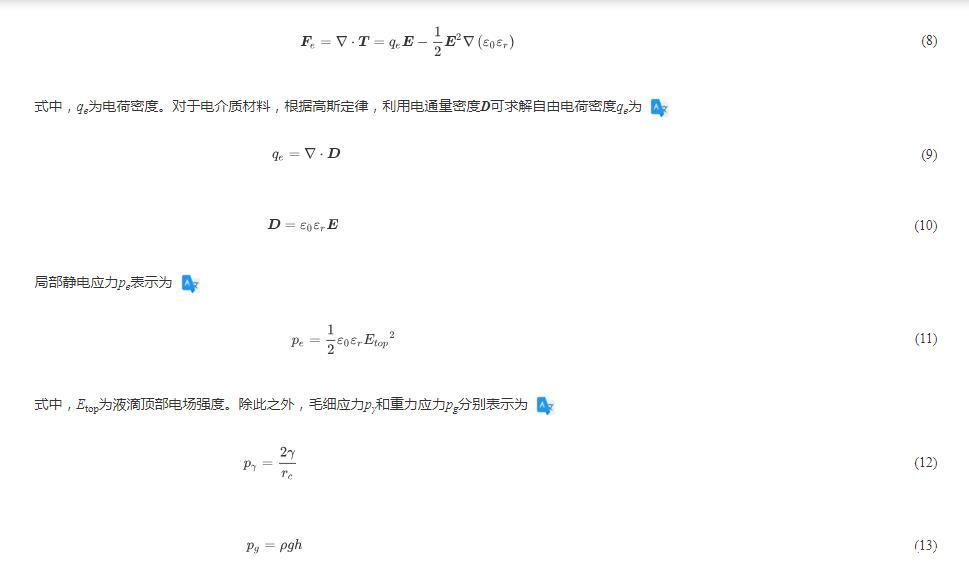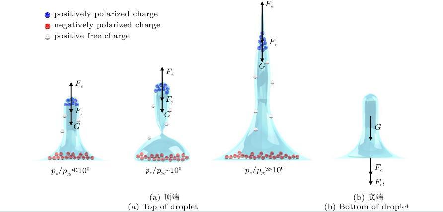 圖4(a)為液滴頂端所受力的方向和液滴整體電荷分布。液滴接觸下極板后,由于離子遷移和極化電荷的產(chǎn)生,中性液滴立即極化,其頂部帶正電荷,底部帶負電荷。根據(jù)庫倫定律,電場方向垂直向上,作用在液滴頂部的靜電力Fe是向上的,與電場方向相同,使液滴不斷向上拉伸,液滴拉伸高度增加,而表面張力Fγ和重力G使液滴向下收縮。基于上述的分析,各個模態(tài)的產(chǎn)生機理均可通過靜電力、表面張力和重力三者間的博弈關(guān)系來分析。三種作用力對液滴的影響大小可用局部靜電應(yīng)力pe、毛細應(yīng)力pγ和重力應(yīng)力pg來表示。靜電力的大小由麥克斯韋應(yīng)力張量T的散度給出,可表示為