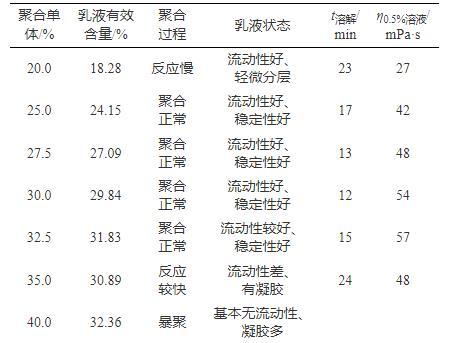 乳液中聚合物有效含量越高,增黏能力越強,使用成本越低,聚合單體濃度直接決定乳液有效含量,并通過影響聚合反應(yīng)過程進而影響減阻劑綜合性能。