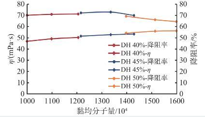 室內(nèi)通過控制水解度(40%~50%)制備了一系列的SRY-1樣品,配制成濃度為0.5%的溶液,測試聚合物不同分子量下的表觀黏度(30 min)和降阻率(Q=45 L/min)。如圖2所示,在優(yōu)化的水解度范圍內(nèi),SRY-1分子量均在1000萬以上,水解度越高,分子量越高;溶液表觀黏度隨分子量的增大而增大,但降阻率隨分子量的增大呈現(xiàn)先緩慢升高后較快降低的趨勢。主要是因為分子量越高,重復(fù)單元數(shù)愈多,分子間越易形成鏈纏結(jié),分子鏈具有更大的流體力學(xué)體積,溶液黏度增大,當(dāng)增大到一定范圍,溶液黏彈性受到影響,降阻率就隨之下降。由數(shù)據(jù)對比,SRY-1分子量控制在1200~1300萬為宜。