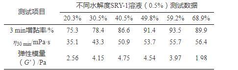 數(shù)據(jù)顯示,隨水解度增大,SRY-1增黏率和表觀黏度都顯著提高,但水解度超過60%后,增黏率又有所降低,SRY-1溶液G'呈現(xiàn)先增大后減小的趨勢。分析認(rèn)為:在一定范圍內(nèi),由于水解度增大,分子鏈更加伸展,分子間共價鍵作用更易形成彈性微觀網(wǎng)絡(luò)結(jié)構(gòu),彈性模量G'增大;隨著水解度繼續(xù)增大,聚合物分子流體力學(xué)體積持續(xù)增大而很難交叉纏繞,黏性行為明顯,彈性減弱,表現(xiàn)為彈性模量G'減小。因此水解度過度提高會造成增黏率下降,溶液黏性增強,彈性降低的負(fù)面影響。由數(shù)據(jù)可知,SRY-1水解度為40%~50%時,SRY-1的3 min增黏率可達(dá)90%以上,溶液黏彈性最為顯著。