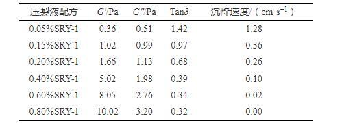 測試表明:隨SRY-1濃度的增加,壓裂液彈性模量G′不斷增大,Tanδ不斷減小,并且SRY-1超過CAC1(0.18%)后,增大和減小的趨勢更明顯。從壓裂液微觀作用機理分析,優良的黏彈特性建立在CAC之上,依靠分子鏈間多重共價鍵交聯作用來形成高強度空間網絡結構,才能在壓裂液懸浮、攜帶支撐劑能力上發揮獨特優勢。為此,進一步測試了40/70支撐劑在壓裂液中的沉降速度,結合壓裂液G′、G″、Tanδ與沉降速度進行關聯分析,如表5所示。