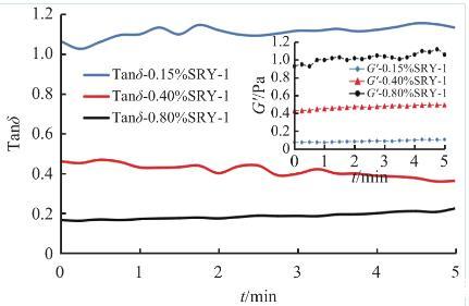 黏彈性是指流體對施加外力的響應,表現為黏性和彈性雙重特性,通常用G′表征彈性模量,G″表征黏性模量,而G″與G′的比值記作Tanδ,用于表征流體黏彈性的強弱:隨Tanδ由大到小變化,流體黏彈特性越明顯,Tanδ>1時,流體流動性強,Tanδ<1時,流體結構性強。對0.15%、0.4%、0.8%SRY-1的壓裂液進行了黏彈性測試(利用RS6000流變儀錐板測試系統進行定頻率定應力掃描實驗,測試得到的彈性模量G′、Tanδ變化情況見圖6所示。