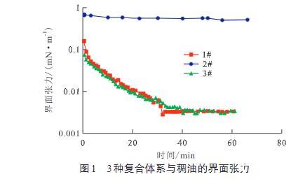 在比較3種復合體系驅(qū)油特征之前,應確定其能否滿足超低界面張力和良好乳化性能的基本設計要求。因此,首先針對選用的復合體系,測試其與稠油的界面張力(圖1)。1#超低界面張力復合體系和3#雙效復合體系與稠油的界面張力均能達到超低水平,為3.0×10-3mN/m;而2#乳化復合體系與稠油的界面張力為5.1×10-1mN/m。3種復合體系與稠油的界面張力表現(xiàn)出顯著的不同,符合進一步驅(qū)油對比的需要。此外,盡管超低界面張力有利于減小毛細管力和稠油在巖石壁面的黏附功,但是對于稠油復合驅(qū),乳化降黏機理極為關鍵,需進一步對3種復合體系的乳化性能加以研究。