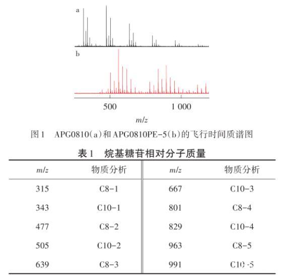 由圖1可以看出,m/z315表示單糖苷的C8烷基糖苷,m/z343表示單糖苷的C10烷基糖苷,m/z477與m/z315相差M(162),162表示一個葡萄糖脫掉一個水的相對分子質量,APG0810的分子質量組成分析如表1所示。