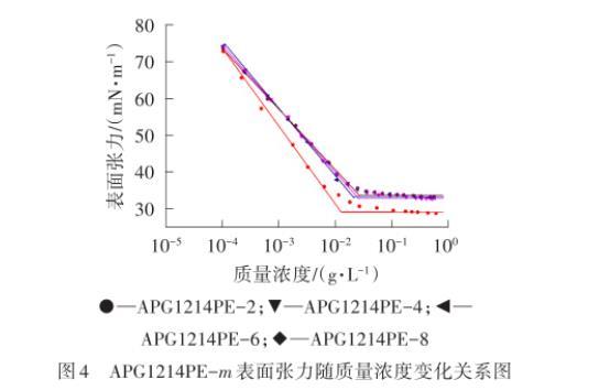 圖4 APG1214PE-m表面張力隨質量濃度變化關系圖